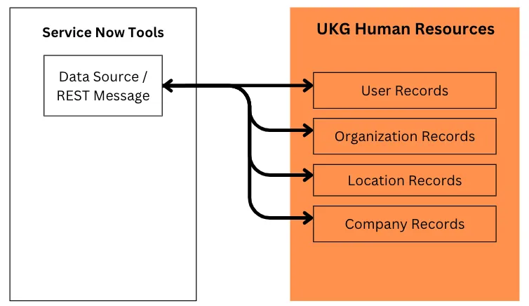 Data Sources / REST Messages act as "getters" of data, enabling ServiceNow to communicate with external sources like UKG Human Resources. You can request various data points such as user start dates, employment status, and location records using REST Messages.