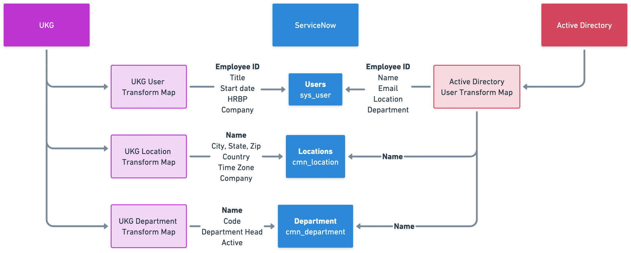 Transform maps are the "manipulators" of data. They take the data retrieved by Data Sources / REST Messages and organize it properly within ServiceNow by either creating new records or updating existing ones. For ServiceNow to correctly place data, it needs to coalesce data via a unique identifier that's consistent across all data sources. For user data from both UKG and Active Directory, we used the employee ID. After transforming your data, you have a robust, up-to-date "3-Dimensional" data point.