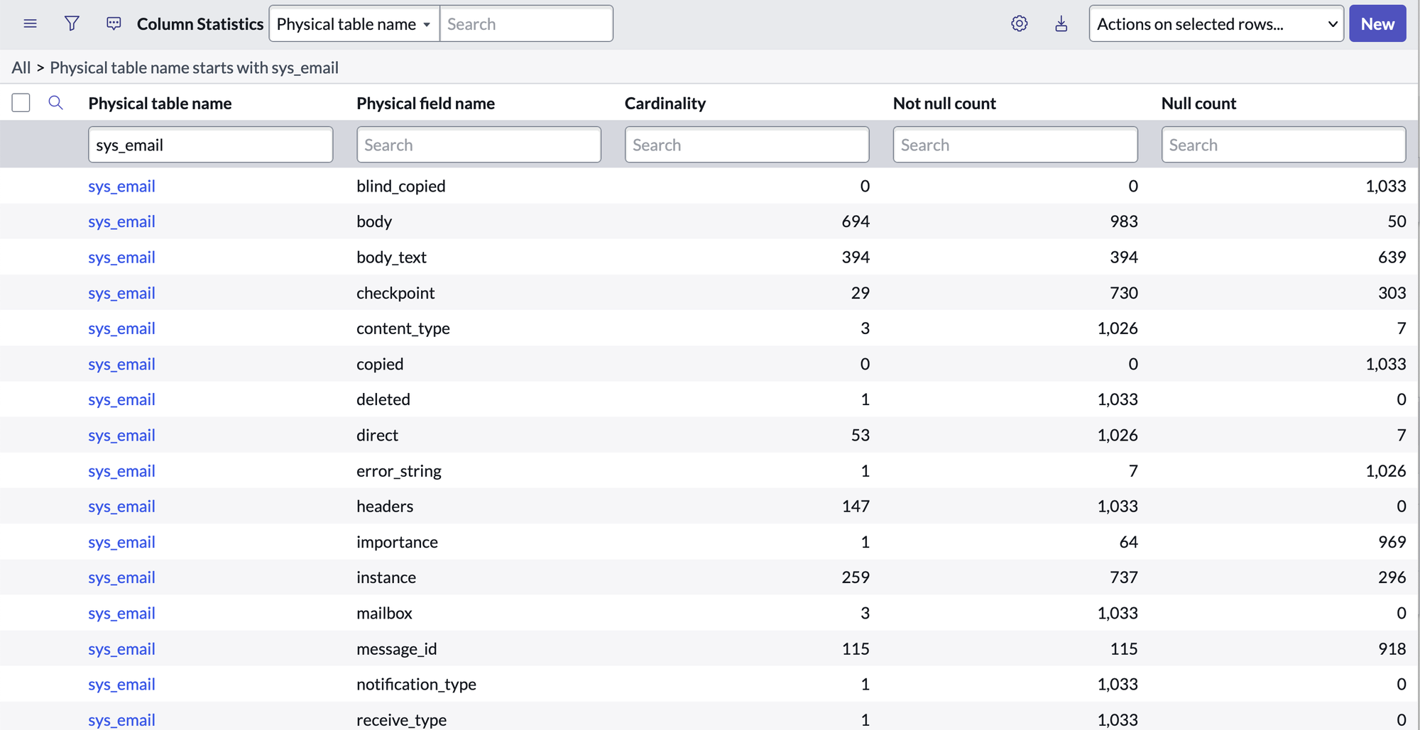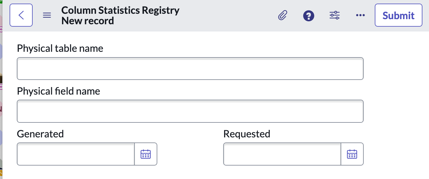 Enter sys_column_stats_registry [Column Statistics Registry]. This table is where you specify which table, and which field(s) you want to generate a report for.